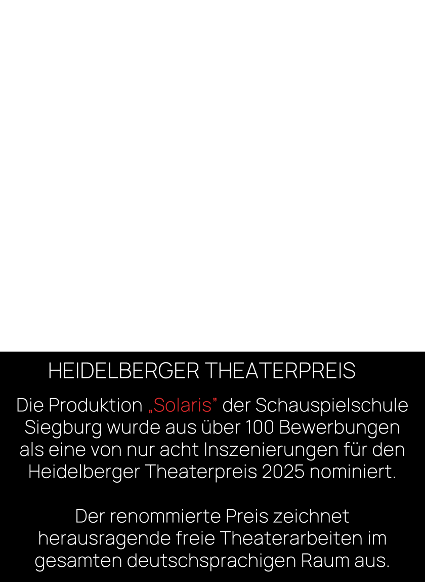 Die Produktion „Solaris“ der Schauspielschule Siegburg wurde aus über 100 Bewerbungen als eine von nur acht Inszenierungen für den Heidelberger Theaterpreis 2025 nominiert.